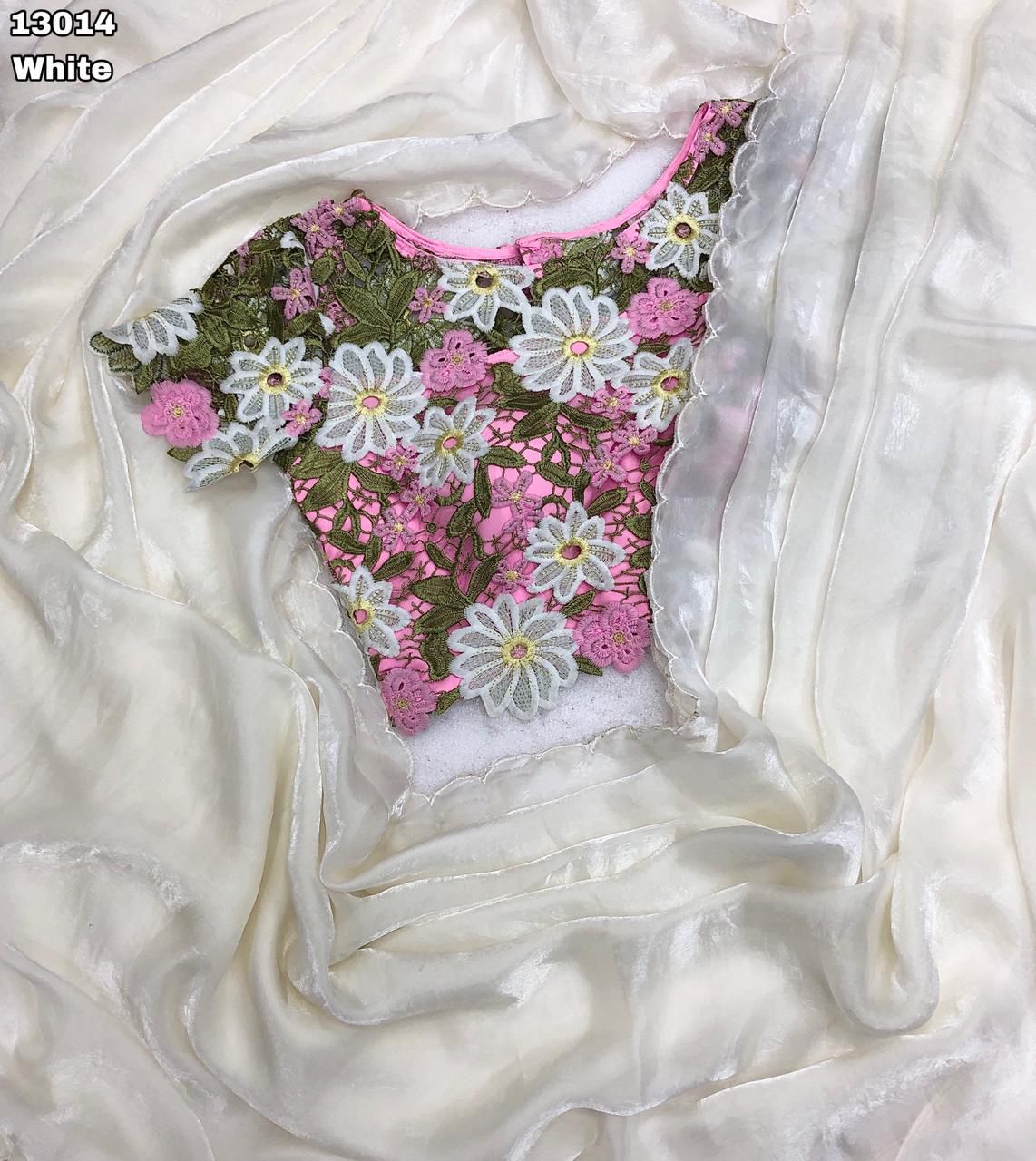 Fabric - Soft & smooth space silk fendy satin plain shining saree with embroidery work scalloped cutwork border